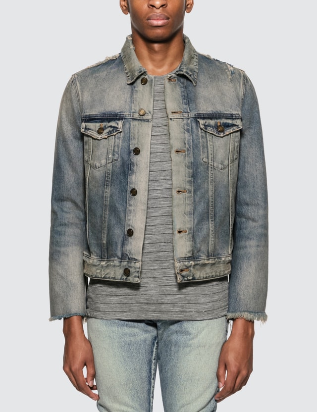 Distressed denim jacket mens. Hit up ASOS DESIGN for denim jackets with faux fur the next best pairing since double denim maybe. The official Levis US website has the best selection of Levis jeans jackets and clothing for men women and kids. Steel-blue cotton and linen-blend deconstructed denim jacket from GREG LAUREN featuring distressed effect long sleeves two front patch pockets and loose fit.